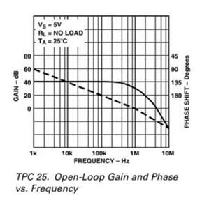 音叉液位開關(guān)模擬采樣回路采用的運(yùn)放型號為AD8544,下圖顯示了AD8544放大器的開環(huán)增益和相位響應(yīng)與頻率的關(guān)系。這是一款10MHz放大器,支持軌到軌輸出,并且只有4fA的偏置電流。主補(bǔ)償電路的-90°相位延遲從大約1KHz達(dá)-90°開始,在約10KHZ時達(dá)到-135°,但在1MHz以上將越過-235°。在實(shí)際應(yīng)用中,由于額外的增益級和輸出級電路,所有放大器除了基本的主補(bǔ)償延遲外,都還有高頻相位延遲。典型的額外相位延遲從大約GBF/10開始。