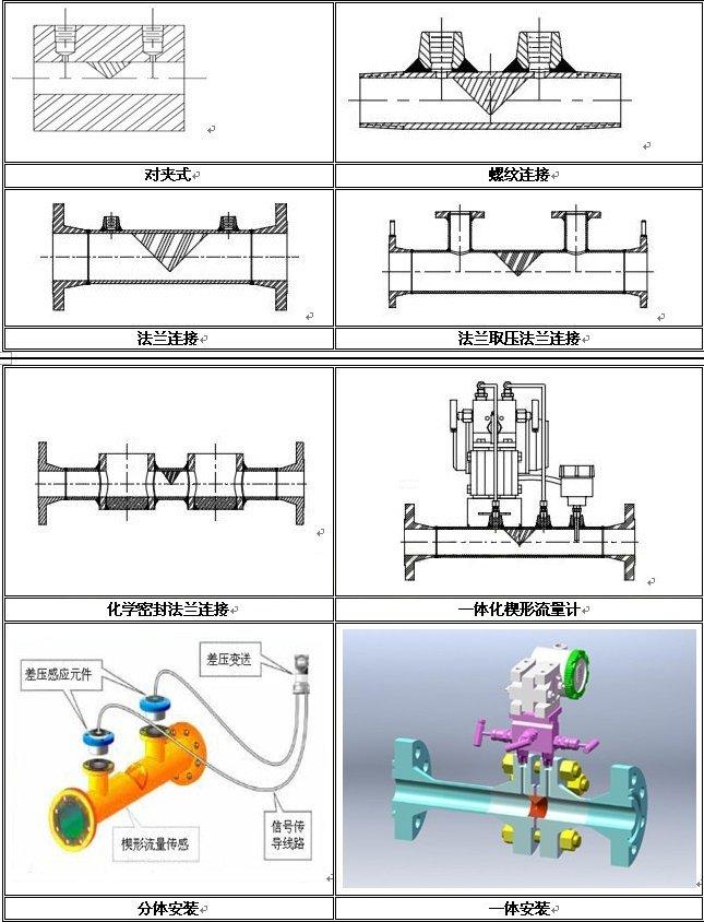 楔形流量計(jì)按其組裝方式分為一體型和分離型,按其連接方式分為法蘭連接、焊接連接、螺紋連接及對夾式連接,按其取壓方式分為普通取壓、法蘭密封取壓等結(jié)構(gòu)。