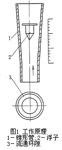 金屬轉(zhuǎn)子流量計的流量檢測元件是由一根自下向上擴(kuò)大的垂直錐形管和一個沿著錐管軸上下移動的浮子組所組成。工作原理如圖1所示,被測流體從下向上經(jīng)過錐管1和浮子2形成的環(huán)隙3時,浮子上下端產(chǎn)生差壓形成浮子上升的力,當(dāng)浮子所受上升力大于浸在流體中浮子重量時,浮子便上升,環(huán)隙面積隨之增大,環(huán)隙處流體流速立即下降,浮子上下端差壓降低,作用于浮子的上升力亦隨著減少,直到上升力等于浸在流體中浮子重量時,浮子便穩(wěn)定在某一高度。浮子在錐管中高度和通過的流量有對應(yīng)關(guān)系。