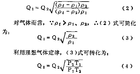 如果兩種不同密度ρ1、ρ2的介質(zhì)分別通過(guò)同臺(tái)轉(zhuǎn)子流量計(jì)時(shí),若浮子平衡在同一位固上,由(1)式得轉(zhuǎn)子流量計(jì)密度換算的基本式: