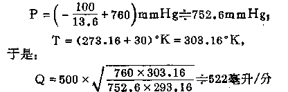 例:使用某空氣采樣儀,運(yùn)行時(shí),采樣儀上轉(zhuǎn)子流量計(jì)讀數(shù)為500毫升/分,測(cè)表前壓為—100mmH 20(因使用抽氣泵,所以是負(fù)壓),現(xiàn)場(chǎng)溫度為30℃,求此時(shí)空氣的實(shí)際流量值。